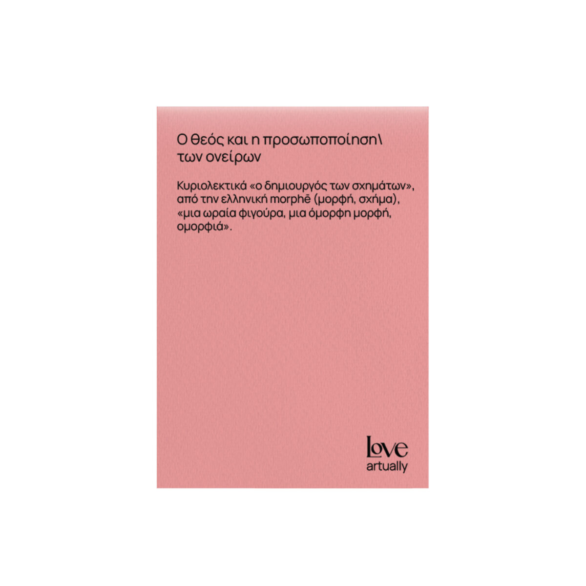 Στο Love Artually, πιστεύουμε ότι η τέχνη είναι μια γέφυρα ανάμεσα στην πραγματικότητα και το όνειρο. Το Sketchbook Morpheus (Μορφέας) είναι το δικό μας #pantheonmeeting με τον Θεό που έχει τη δύναμη να παίρνει οποιαδήποτε ανθρώπινη μορφή στα όνειρά μας. Στην Ancient Greece, ο Μορφέας ήταν ο αγγελιοφόρος των θεών στον κόσμο του ύπνου. Σήμερα, αυτό το sketchbook γίνεται ο δικός σου αγγελιοφόρος, επιτρέποντας στη φαντασία σου να “μορφωθεί” πάνω σε λευκές, ποιοτικές σελίδες.