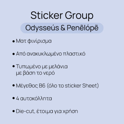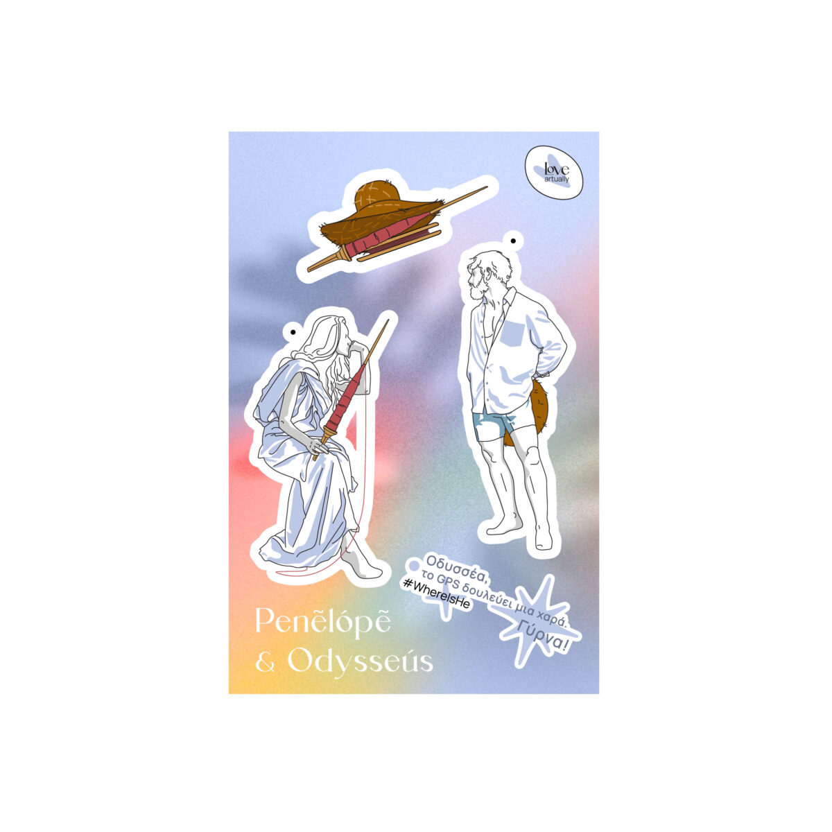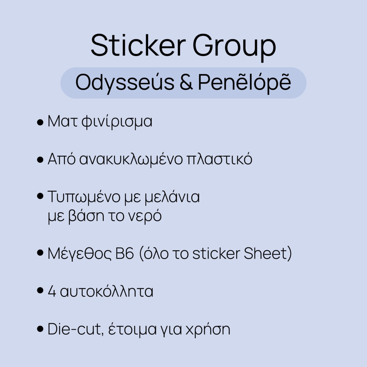 Το σετ περιλαμβάνει 4 ξεχωριστά die-cut αυτοκόλλητα που αποδίδουν τον Οδυσσέα, την Πηνελόπη και συμβολικά στοιχεία της οδύσσειάς τους.