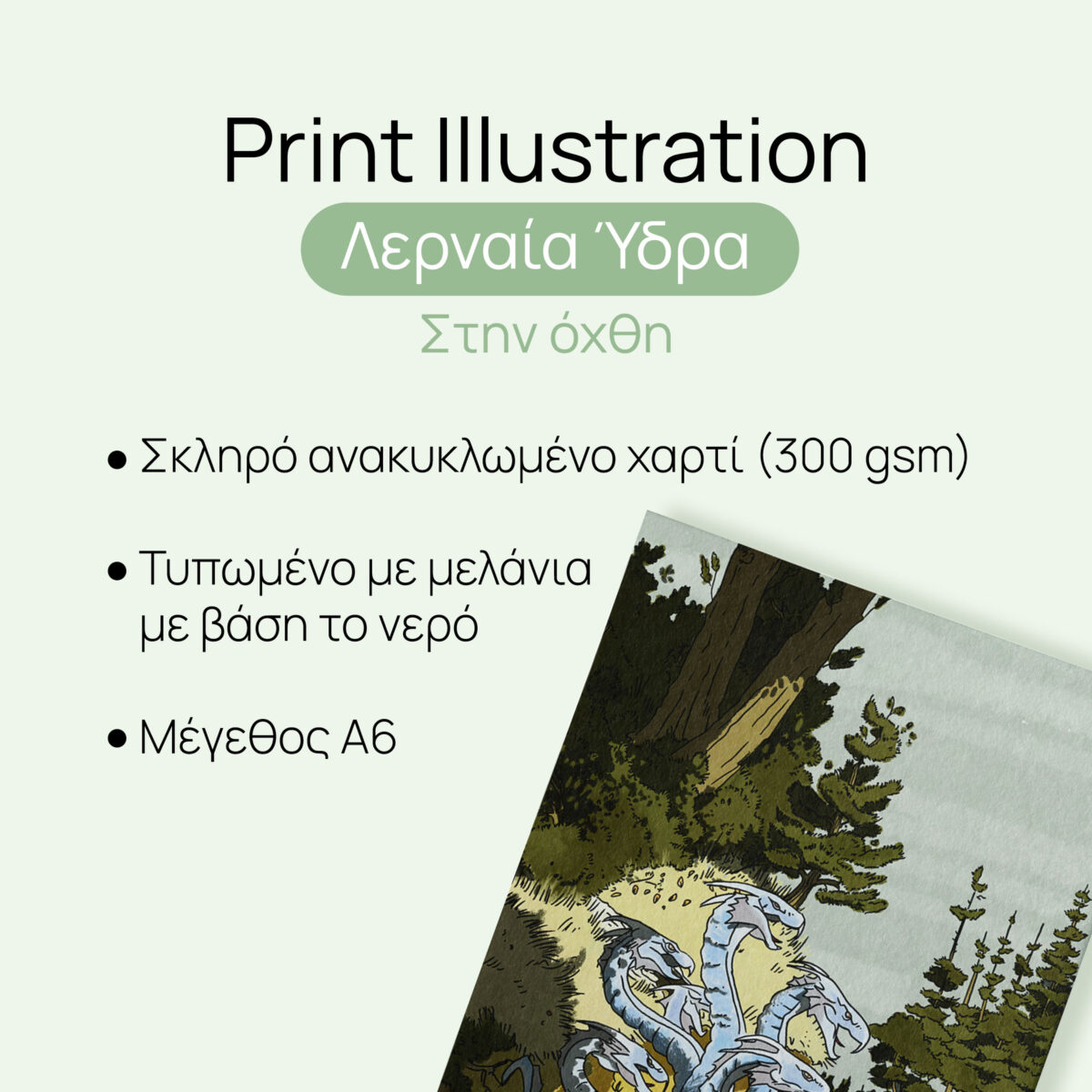 Όπως η Ύδρα είναι άρρηκτα συνδεδεμένη με τη φύση, έτσι κι εμείς φροντίζουμε η τέχνη μας να μην την επιβαρύνει. Το Art Print Lernaean Hydra είναι ένα Eco-friendly και Vegan Product, τυπωμένο σε 100% ανακυκλωμένο χαρτί υψηλής ποιότητας. Χρησιμοποιούμε οικολογικά μελάνια βάσης νερού, διασφαλίζοντας ότι το καλλιτεχνικό μας αποτύπωμα είναι θετικό για τον πλανήτη. Η στιβαρή υφή του ανακυκλωμένου χαρτιού προσδίδει μια αυθεντική, σχεδόν αρχέγονη αίσθηση στο εικαστικό, κάνοντάς το να ξεχωρίζει σε οποιοδήποτε δωμάτιο.