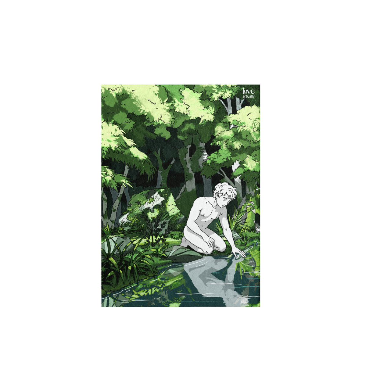 Στο Love Artually, οι μύθοι της Ancient Greece λειτουργούν ως εργαλεία για να κατανοήσουμε τη σύγχρονη πραγματικότητα. Το Art Print Narcissus (Νάρκισσος), από τη συλλογή Modern Myths, είναι μια εικονογράφηση που προσεγγίζει τον γνωστό μύθο με μια εντελώς νέα οπτική. Ο Νάρκισσος σκύβει πάνω στο νερό, όχι μόνο για να θαυμάσει την ομορφιά του, αλλά για να βρει το πρόσωπό του σε έναν κόσμο γεμάτο ερωτηματικά. Για εμάς, ο Νάρκισσος αντιπροσωπεύει τη διαδρομή που μας κάνει να αναγνωρίσουμε τον εαυτό μας – μια διαδρομή που απαιτεί θάρρος, ειλικρίνεια και την επιθυμία να δούμε πέρα από την επιφάνεια.