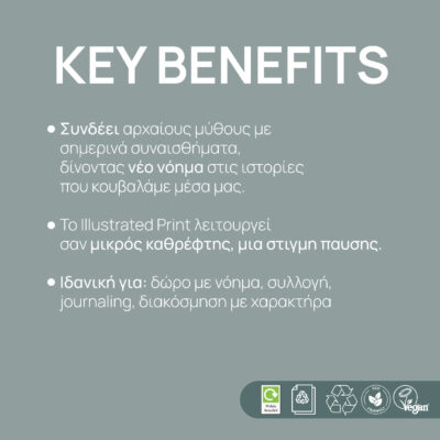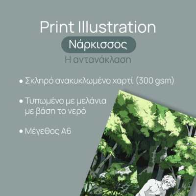 Η αγάπη για τον εαυτό μας ξεκινά από τη φροντίδα για το σπίτι μας – τον πλανήτη Γη. Το Art Print Narcissus είναι ένα 100% Eco-friendly και Vegan Product. Τυπώνεται σε 100% ανακυκλωμένο χαρτί υψηλής ποιότητας, χρησιμοποιώντας οικολογικά μελάνια με βάση το νερό. Η επιλογή των υλικών μας αντανακλά τη δέσμευση του Love Artually για μια βιώσιμη καλλιτεχνική δημιουργία. Η υφή του χαρτιού προσδίδει μια οργανική αίσθηση στην εικονογράφηση, κάνοντας τις γραμμές του Νάρκισσου να μοιάζουν ζωντανές και διαχρονικές, όπως και ο ίδιος ο μύθος.