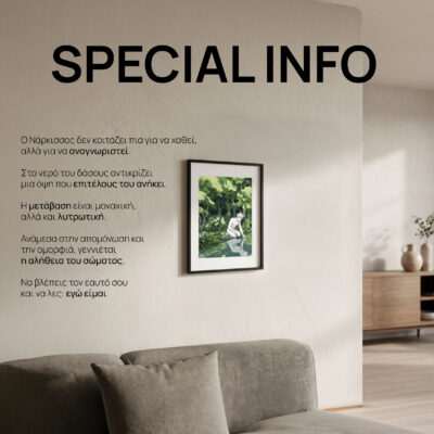 Συχνά ο Νάρκισσος παρερμηνεύεται ως σύμβολο κενότητας. Όμως, το #pantheonmeeting μας μαζί του αποκαλύπτει κάτι βαθύτερο: το ερώτημα της ταυτότητας. Σε έναν κόσμο ψηφιακών αντανακλάσεων, αυτό το print μας υπενθυμίζει την αξία της εσωτερικής αναζήτησης. Η στιγμή που ο ήρωας κοιτάζει το είδωλό του είναι η στιγμή της μεγάλης μεταμόρφωσης. Είναι η αλήθεια που βρίσκουμε όταν σταματάμε να κοιτάμε τι περιμένουν οι άλλοι από εμάς και αρχίζουμε να παρατηρούμε ποιοι είμαστε πραγματικά. Ο Νάρκισσος είναι ο ήρωας της ενδοσκόπησης, και αυτό το εικαστικό τιμά όσους “περνούν τον καθρέφτη” για να βρουν την ουσία.
