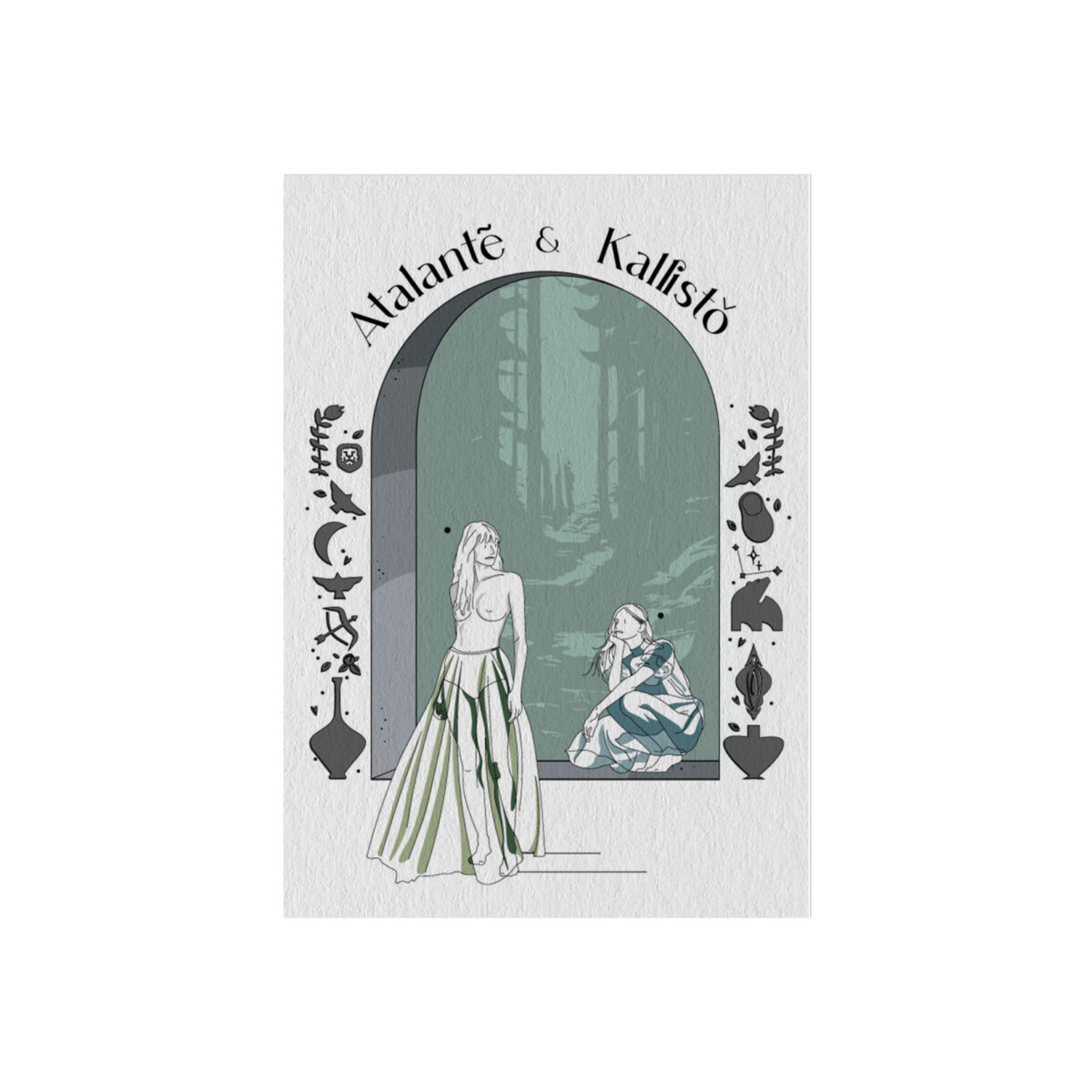 Η Αταλάντη και η Καλλιστώ δεν είναι απλώς δύο φιγούρες της μυθολογίας. Είναι το σύμβολο της ελευθερίας και της πίστης στον εαυτό μας. Σε έναν κόσμο που προσπάθησε να τις περιορίσει, εκείνες δεν έτρεξαν μακριά – έτρεξαν μαζί. Η Αταλάντη, η ανίκητη κυνηγός, και η Καλλιστώ, η πιστή ακόλουθος της Αρτέμιδος, μοιράζονται έναν μύθο που ανθίζει κόντρα σε κάθε προσδοκία. Σε αυτή την καρτ ποστάλ, το βλέμμα τους συναντιέται, αποτυπώνοντας μια στιγμή απόλυτης σύνδεσης. Είναι η ιστορία δύο γυναικών που διάλεξαν η μία την άλλη, αποδεικνύοντας ότι η αγάπη και η φύση μιλούν πάντα την ίδια, ειλικρινή γλώσσα.