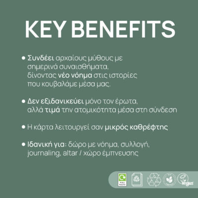 Όπως κάθε δημιουργία μας, έτσι και αυτή η κάρτα ακολουθεί το Vegan Ethos του brand μας. Η Card Postal Atalante & Kallisto είναι τυπωμένη σε 100% ανακυκλωμένο χαρτί υψηλής ποιότητας, χρησιμοποιώντας αποκλειστικά μελάνια με βάση το νερό. Αυτό σημαίνει ότι κάθε φορά που γράφετε ένα μήνυμα σε αυτή την κάρτα, δεν μεταφέρετε μόνο λέξεις, αλλά και την υπόσχεση για ένα πιο πράσινο μέλλον. Η υφή του ανακυκλωμένου χαρτιού προσθέτει μια αυθεντικότητα και μια “vintage” αίσθηση που ταιριάζει απόλυτα με το θέμα της Ancient Greece.
