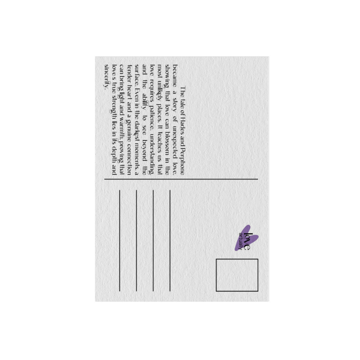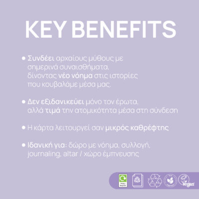 Συχνά νιώθουμε ότι πρέπει να κρύβουμε τον πραγματικό μας εαυτό για να γίνουμε αποδεκτοί. Όμως, όπως η Περσεφόνη ανακαλύπτει την αγάπη στον Κάτω Κόσμο, έτσι κι εμείς μπορούμε να βρούμε την αποδοχή όταν αγκαλιάσουμε την αλήθεια μας. Η Love Artually τιμά αυτή τη διαδρομή χρησιμοποιώντας 100% ανακυκλωμένο χαρτί και μελάνια με βάση το νερό για τη δημιουργία αυτής της κάρτας. Είναι ένα Eco-friendly προϊόν που αντανακλά την ποιότητα και το Vegan ήθος μας, διασφαλίζοντας ότι το μήνυμά σας θα έχει το μικρότερο δυνατό περιβαλλοντικό αποτύπωμα.