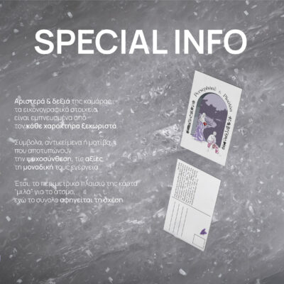 Κάθε Card Postal κρύβει το δικό της μήνυμα στο πίσω μέρος, εκσυγχρονίζοντας τον αρχαίο μύθο της Ancient Greece για το σήμερα. Ο Πλούτωνας και η Περσεφόνη μας διδάσκουν ότι μαθαίνουμε από τους γύρω μας και από τους αγαπημένους μας, όπως ακριβώς μαθαίνουν και αυτοί από εμάς. Μια χειρόγραφη κάρτα είναι το ιδανικό μέσο για να ταξιδέψεις κάποιον σε μια άλλη πραγματικότητα. Διέσωσε τη στιγμή, δείξε τον πραγματικό σου εαυτό και στείλε τη δική σου αλήθεια σε κάποιον που την έχει ανάγκη. Γιατί το πιο σημαντικό στην ζωή σου είσαι εσύ, και ο δικός σου χρόνος είναι πολύτιμος. 🔮🎶