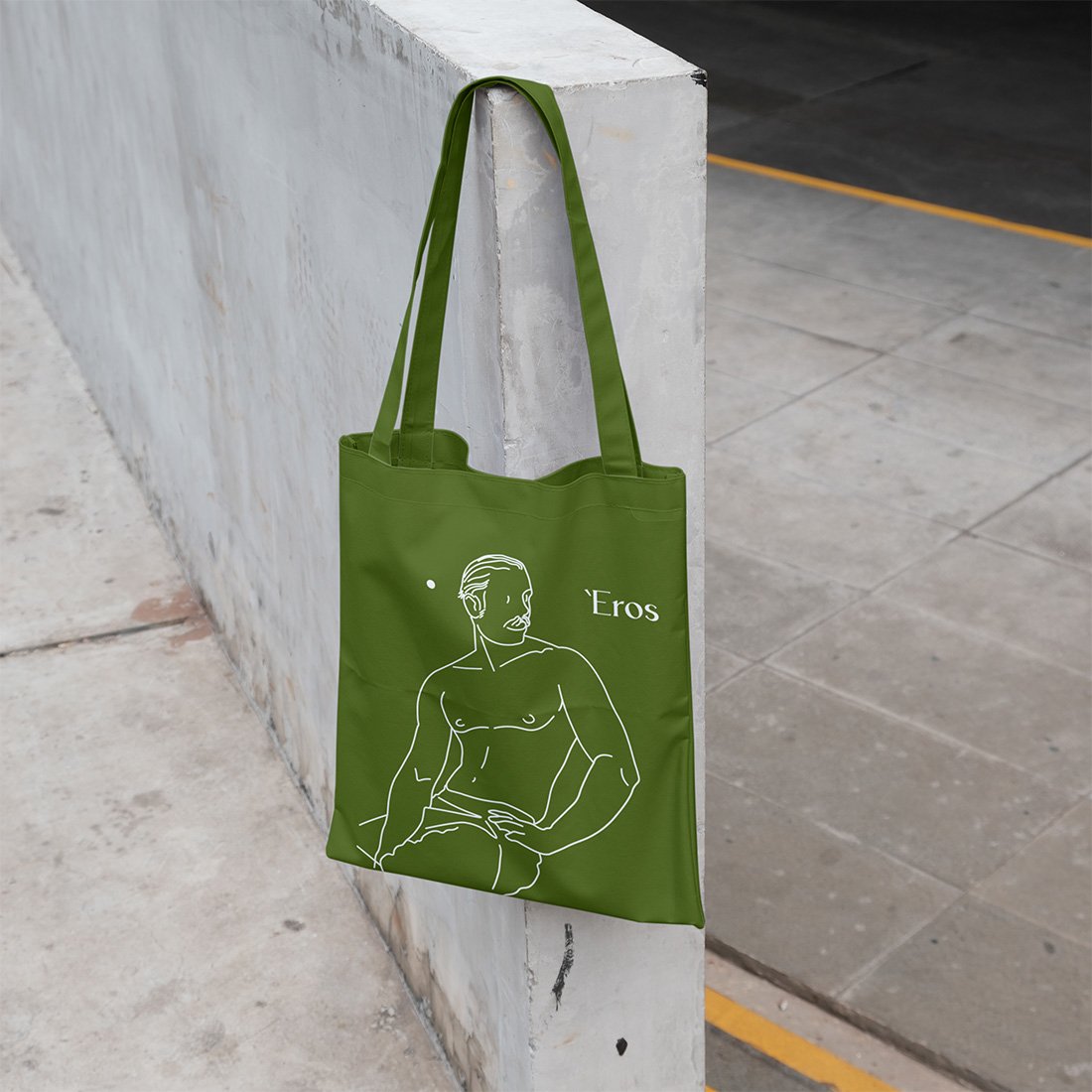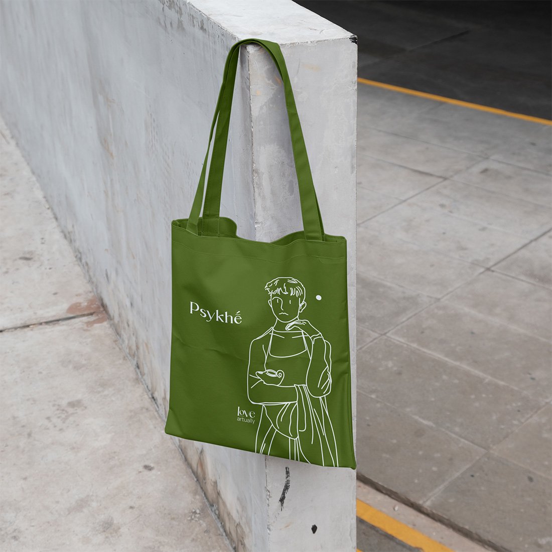 Cupid and Soul, the eternal couple that proves that love requires faith and sacrifice. Their look on the front tells the myth, while on the back, the heart of their story is captured in eco-friendly materials.