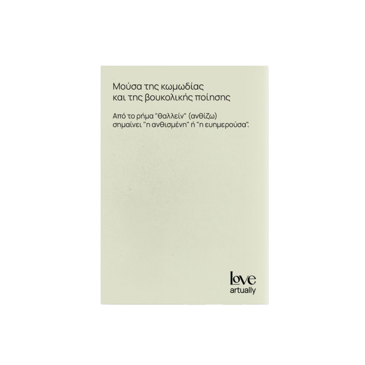 Στο Love Artually, πιστεύουμε ότι η χαρά είναι η πιο δυνατή μορφή δημιουργίας. Το σημειωματάριο Notebook Muse Thalia (Μούσα Θάλεια) είναι το δικό μας #pantheonmeeting με τη Μούσα της κωμωδίας. Η Θάλεια, η προστάτιδα της ευθυμίας και των ανθοστόλιστων γιορτών στην Ancient Greece, μας καλεί να δούμε τη φωτεινή πλευρά των πραγμάτων. Αυτό το notebook δεν είναι απλώς ένα αξεσουάρ γραφείου, αλλά ένας σύντροφος που σε ενθαρρύνει να καταγράψεις κάθε στιγμή που σε έκανε να γελάσεις με την καρδιά σου, γεμίζοντάς σε με σιγουριά και θετική ενέργεια.