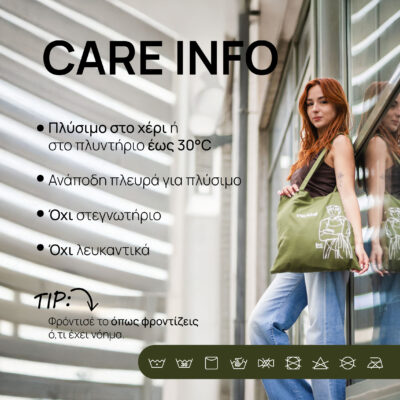 Πλύνε την τσάντα στους 30°C, αποφεύγοντας το δυνατό στίψιμο, και σιδέρωσε από την εσωτερική πλευρά για να προστατέψεις το τύπωμα.