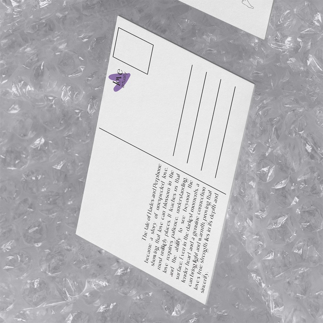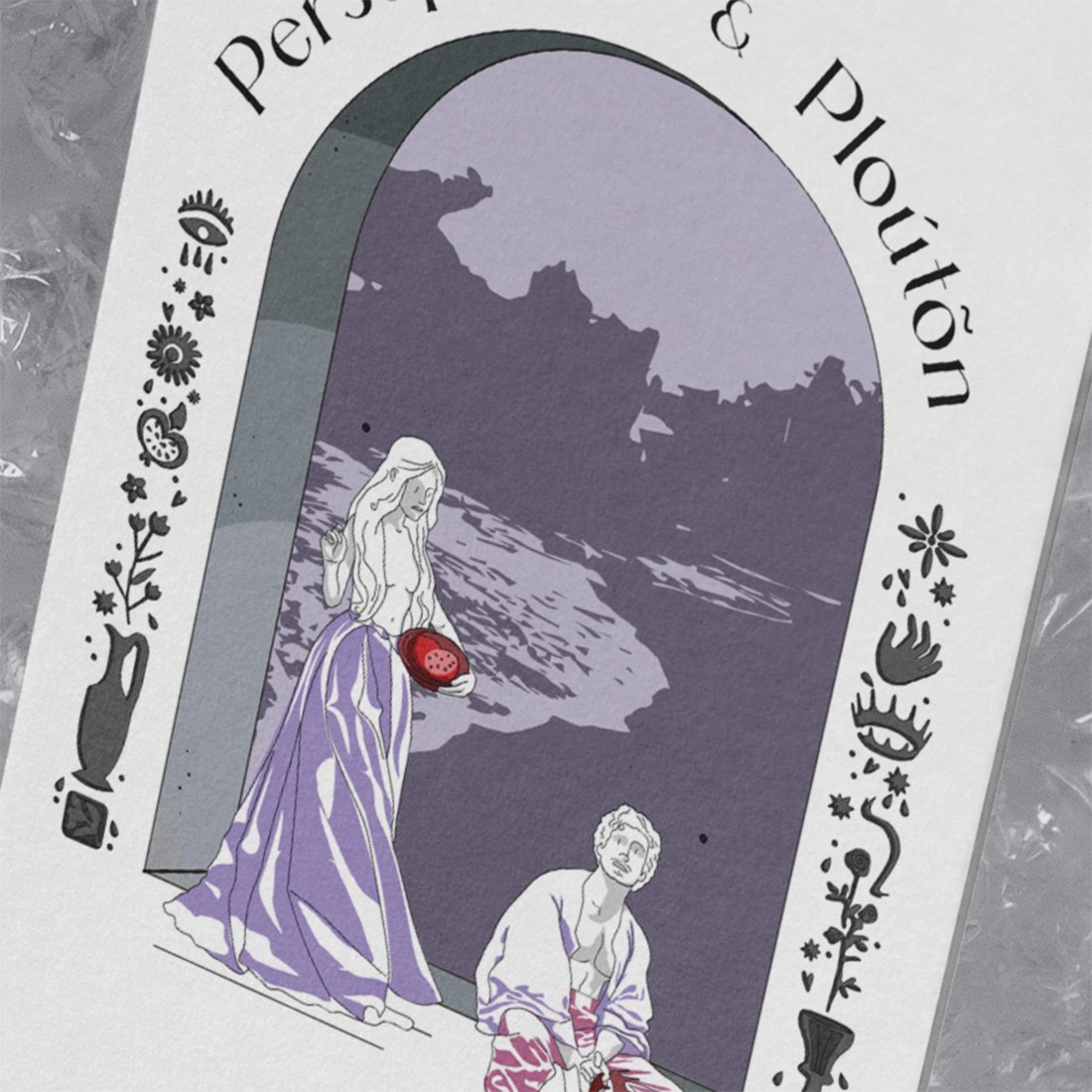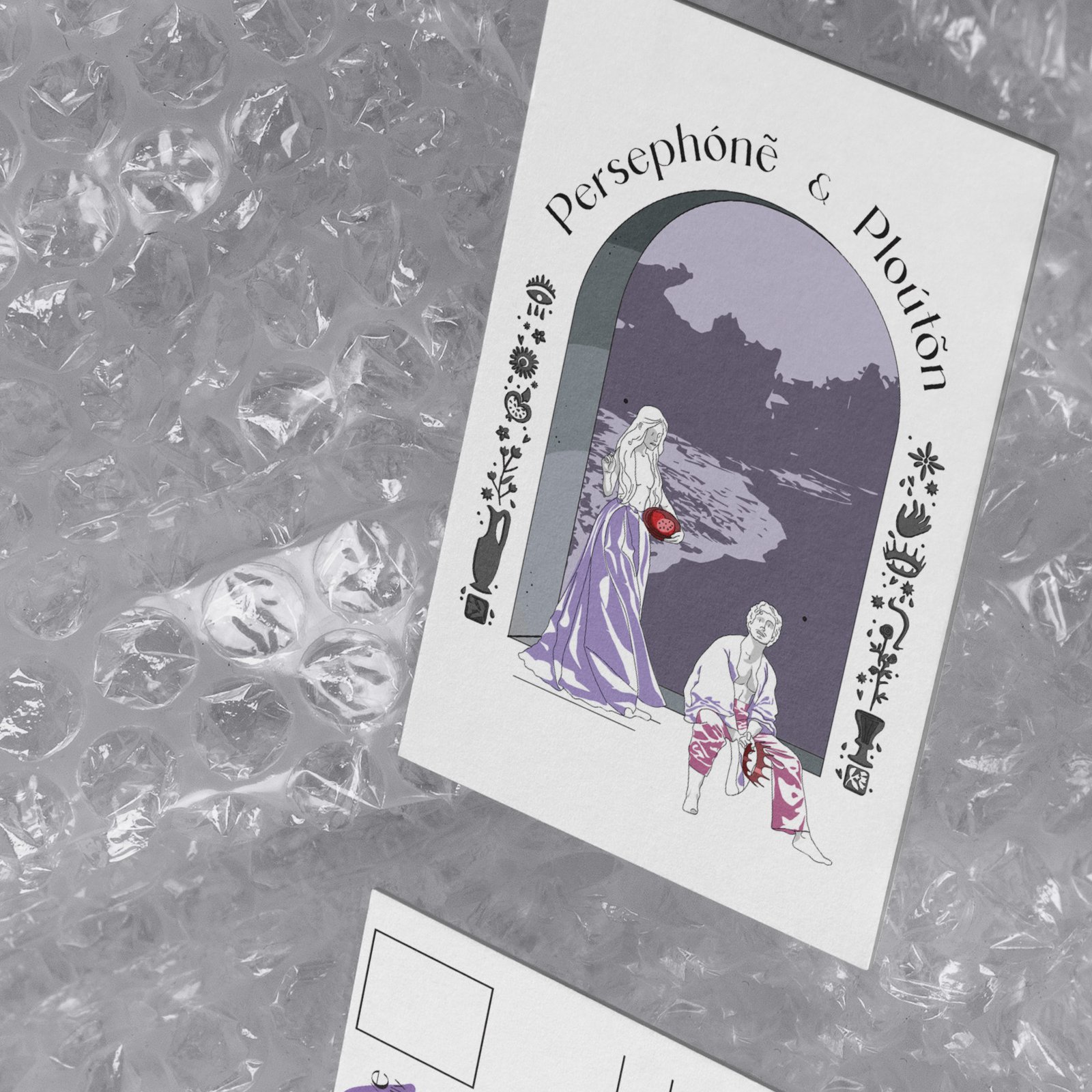 Persephone, goddess of spring, and Pluto, lord of the underworld, in a story about love finding light even in the deepest darkness. On the front of the postcard, the look that tells the legend. On the back, the essence of their story written in eco-friendly ink.