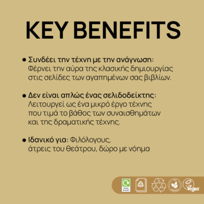 Ο τρόπος που επιλέγεις να σημαδέψεις τις σελίδες σου δείχνει τον σεβασμό σου προς την ιστορία που διαβάζεις. Η Melpomene είναι ο ιδανικός σελιδοδείκτης για κλασική λογοτεχνία, ποίηση ή σύγχρονα δράματα που σε αγγίζουν βαθιά. Είναι ένας “μικρός μύθος” που μπορείς να πάρεις μαζί σου παντού. Επιπλέον, αποτελεί το τέλειο δώρο για κάθε βιβλιοφάγο που αναζητά κάτι περισσότερο από ένα απλό χαρτί: αναζητά μια σύνδεση με το παρελθόν και μια έμπνευση για το παρόν.