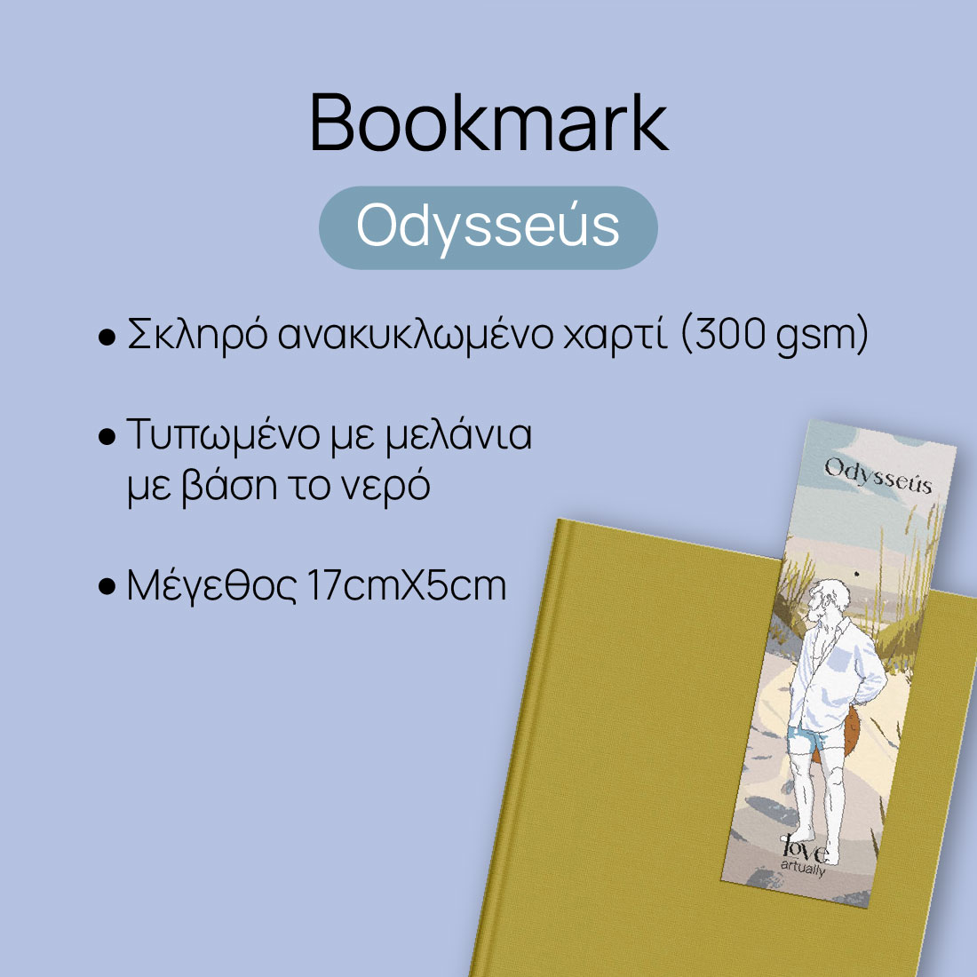 Όπως ο Οδυσσέας σεβόταν τις θάλασσες (τις περισσότερες φορές!), έτσι κι εμείς σεβόμαστε το περιβάλλον. Ο σελιδοδείκτης Odysseus είναι ένα 100% Eco-friendly και Vegan Product. Χρησιμοποιούμε 100% ανακυκλωμένο χαρτί υψηλής ποιότητας και οικολογικά μελάνια με βάση το νερό. Η επιλογή των υλικών μας αντανακλά τη δέσμευση του Love Artually για ένα βιώσιμο μέλλον, όπου η τέχνη και η μυθολογία δεν επιβαρύνουν τον πλανήτη. Η αίσθηση του χαρτιού είναι στιβαρή και ανθεκτική, έτοιμη να αντέξει σε “θύελλες” και αμέτρητα ξεφυλλίσματα.