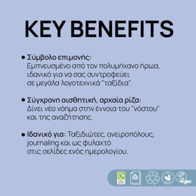 Ένας σελιδοδείκτης είναι το “νήμα” που σε κρατάει συνδεδεμένο με την ιστορία σου. Ο τρόπος που λες μια ιστορία συχνά είναι και το μέσο για να ταξιδέψεις κάποιον σε μια άλλη πραγματικότητα. Επιλέγοντας τον σελιδοδείκτη Odysseus, επιλέγεις να στηρίξεις τη δημιουργικότητα και τη βιωσιμότητα. Είναι το τέλειο δώρο για τον εαυτό σου ή για εκείνον τον φίλο που έχει πάντα ένα βιβλίο στην τσάντα του και ένα όνειρο για ταξίδι στο μυαλό του. Γίνε κι εσύ ένας Modern Myth maker και άφησε τον Οδυσσέα να φυλάει τη σελίδα σου μέχρι την επόμενη φορά που θα βυθιστείς στον κόσμο των λέξεων.